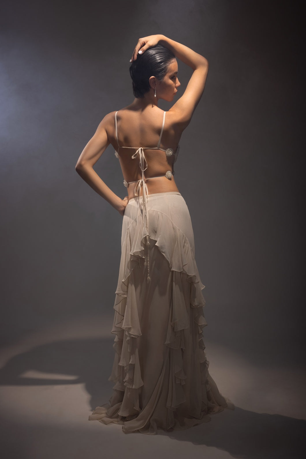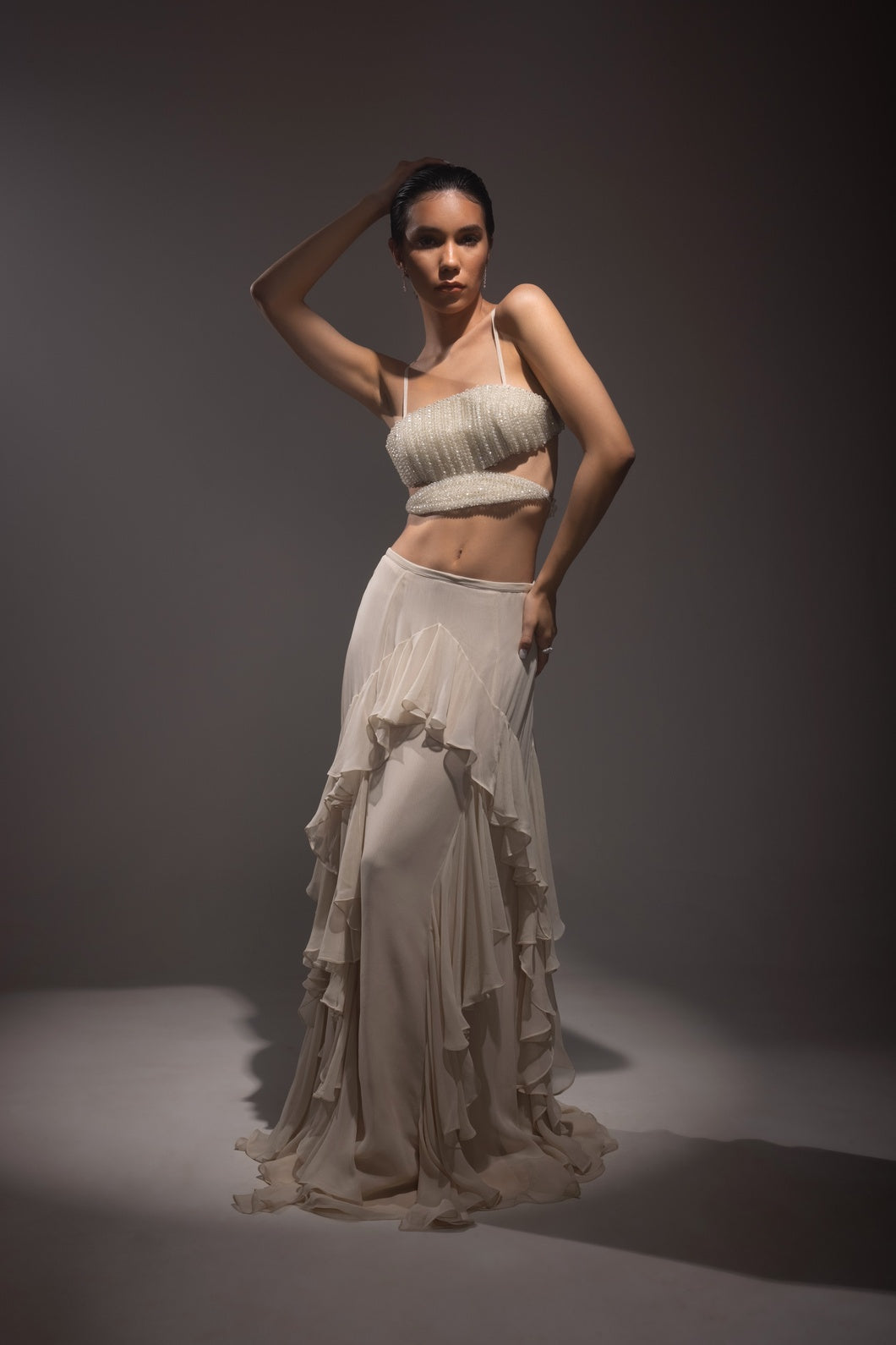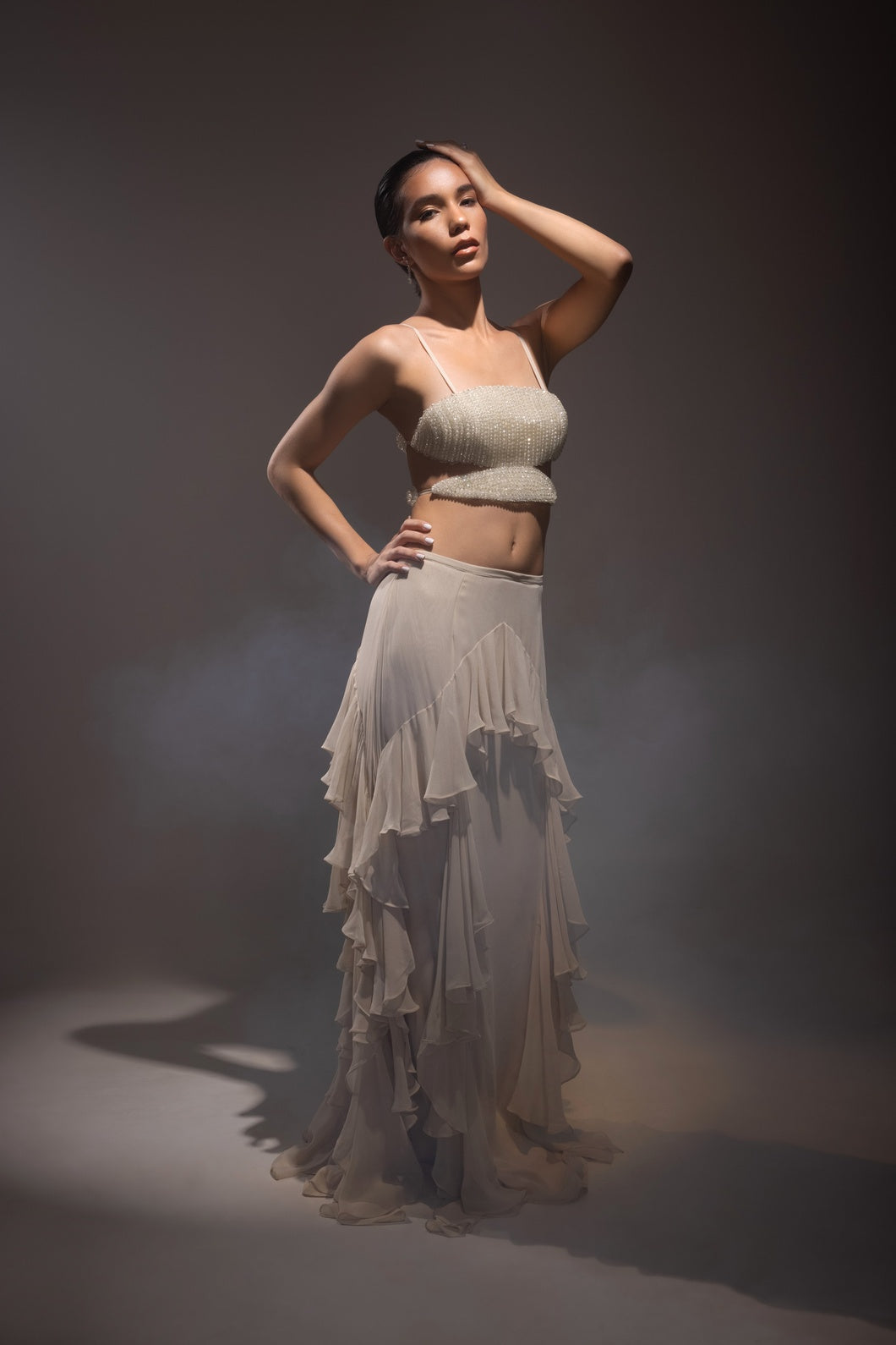 The two-panel crystal blouse is embellished with directional play hand embroidery and intricate 3D floral crystals on each side. Finished with a delicate tie-up back. Paired with a sculpted ruffle skirt with cascading asymmetrical layers.