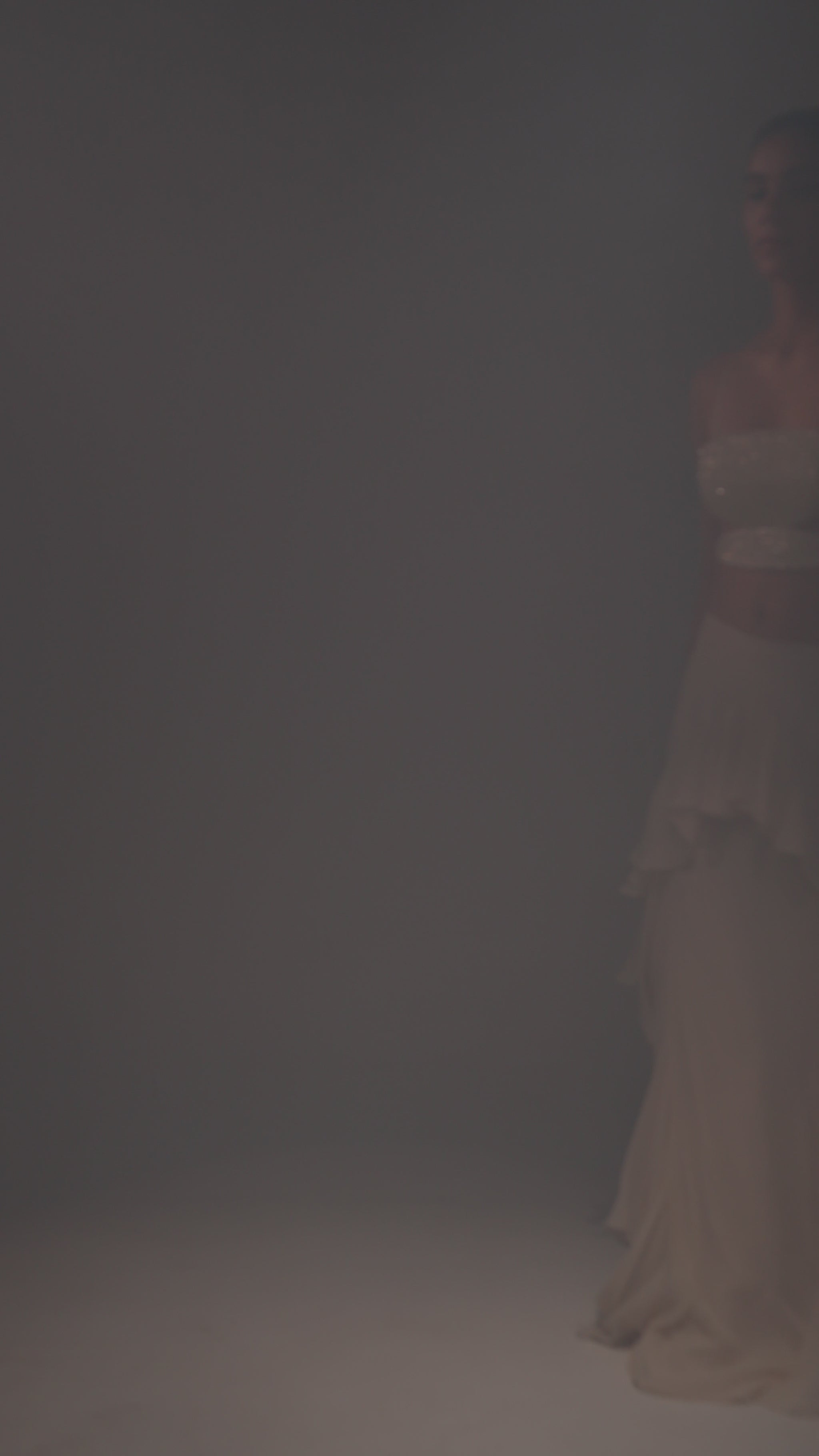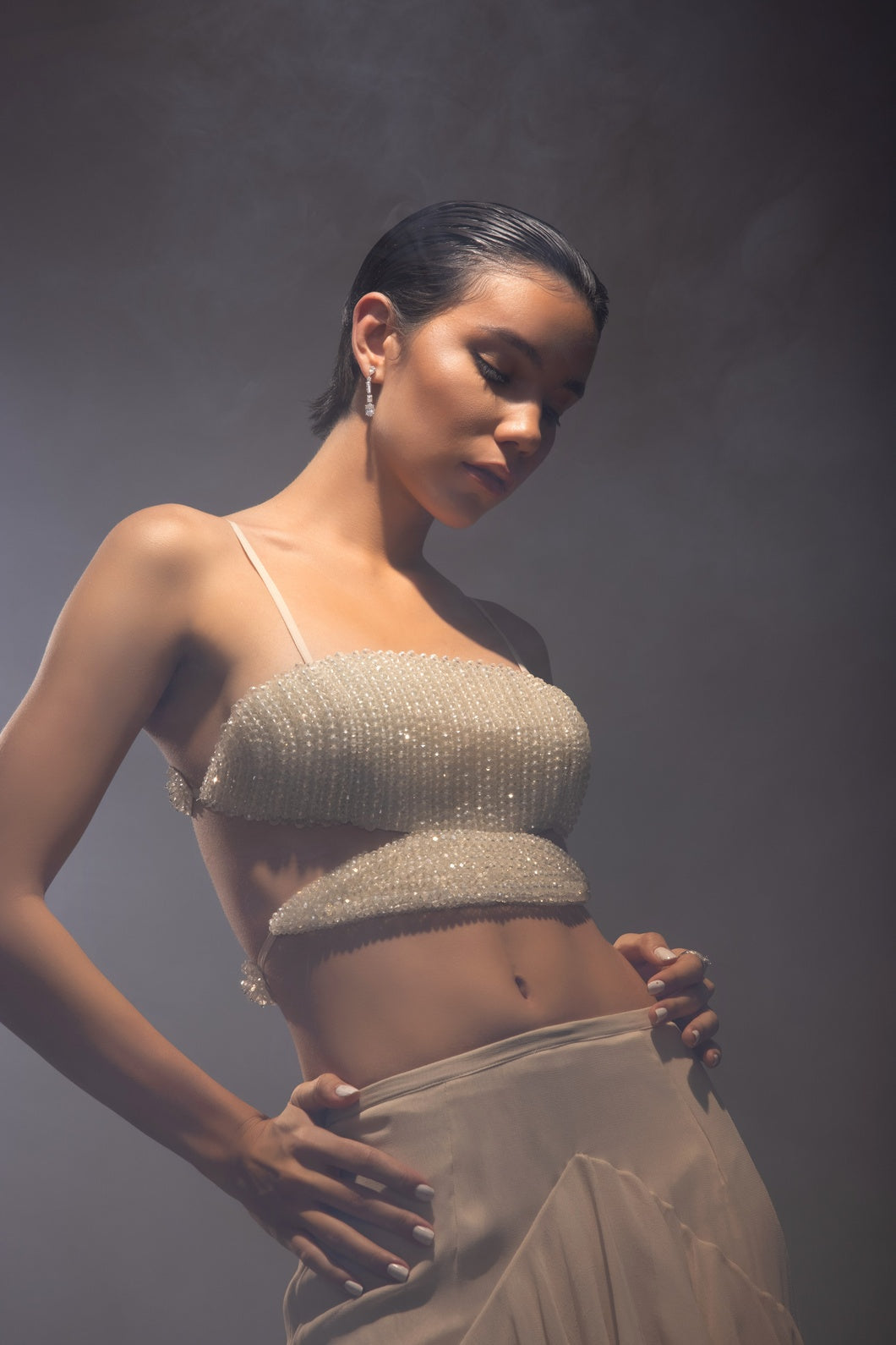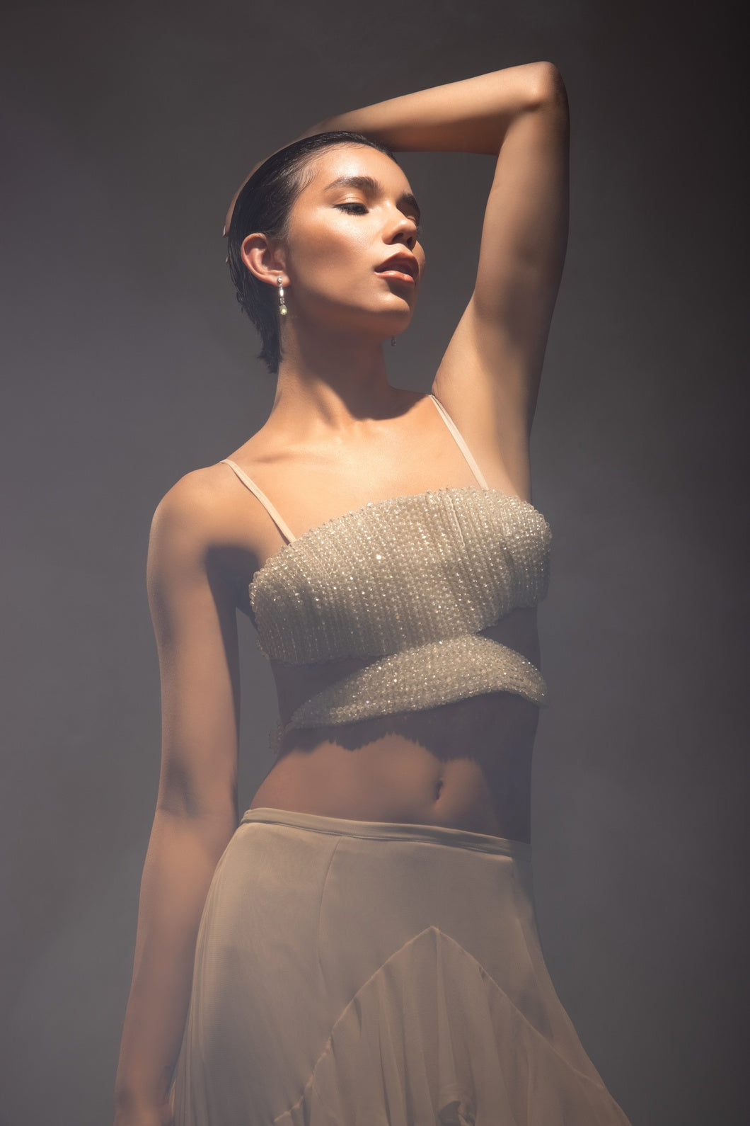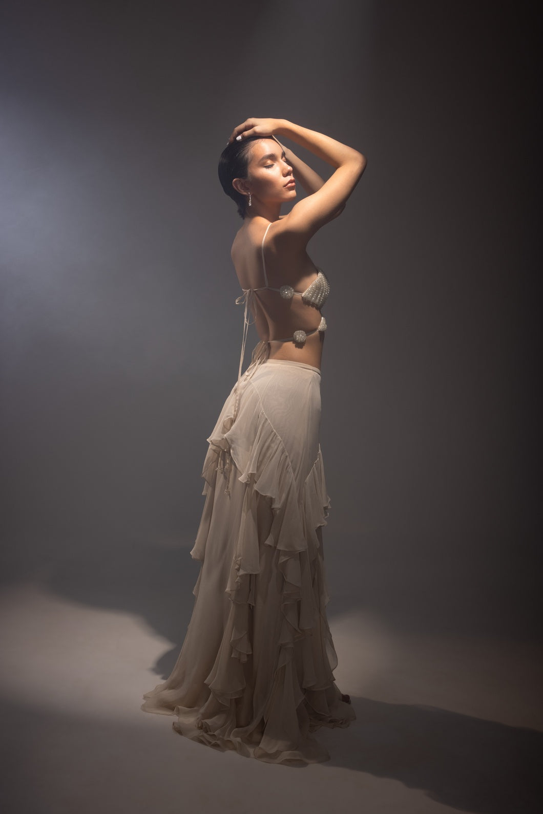 The two-panel crystal blouse is embellished with directional play hand embroidery and intricate 3D floral crystals on each side. Finished with a delicate tie-up back. Paired with a sculpted ruffle skirt with cascading asymmetrical layers.