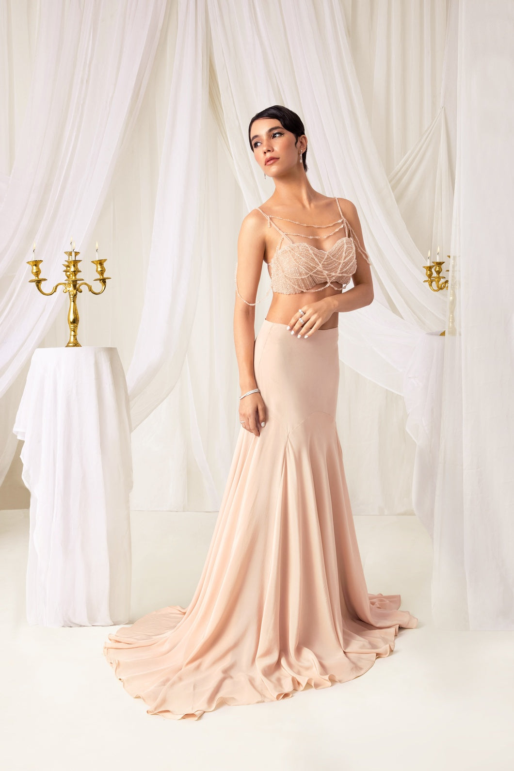 Crystal blouse adorned with intricate hand-embellished sheeting and delicate crystal strands, with a striking open back. Paired with a minimal yet impactful fishtail skirt.