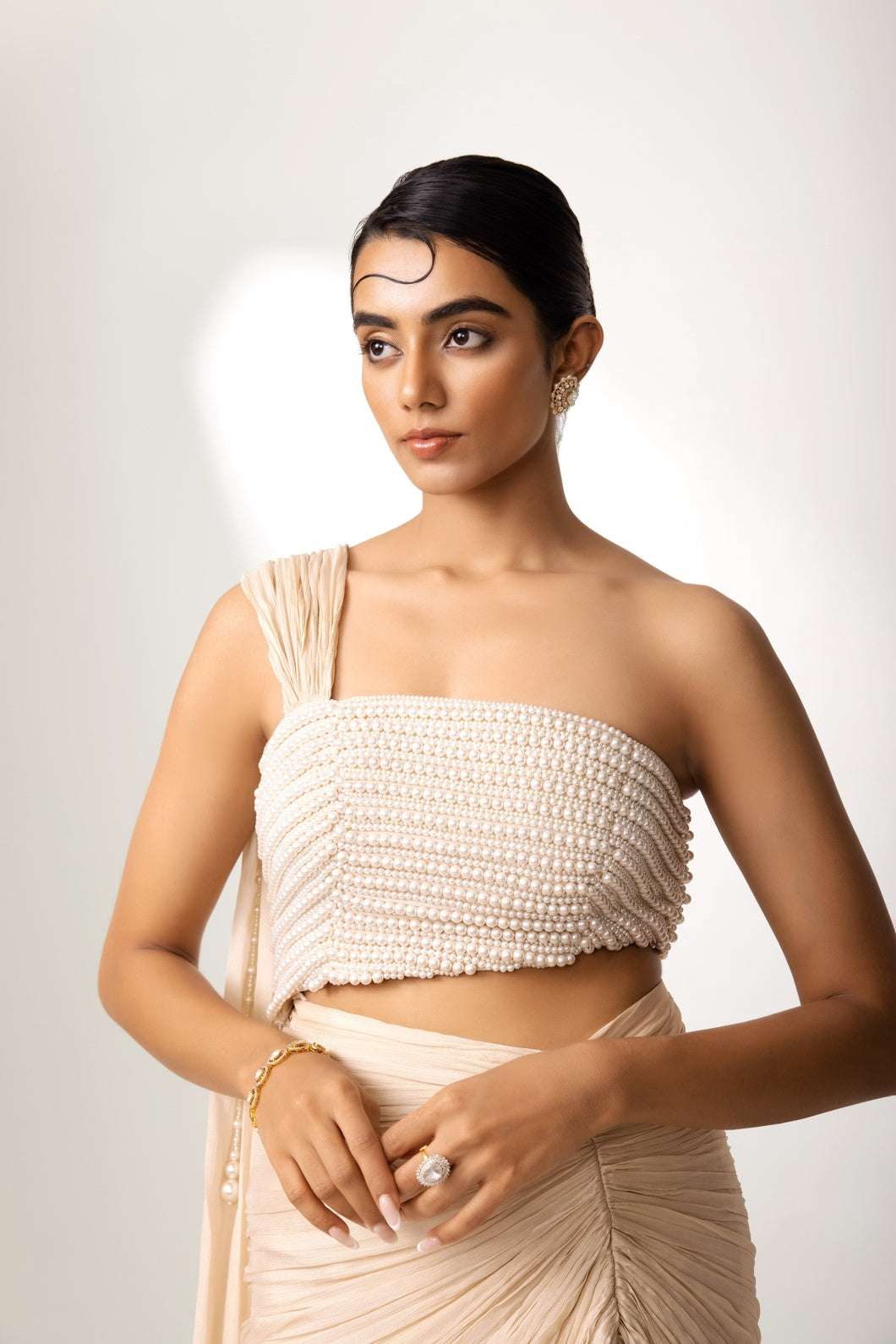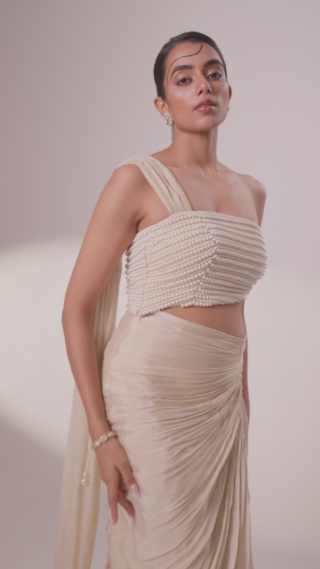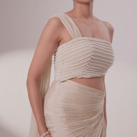 Our asymmetrical pearl-embellished blouse features intricate linear pearl work that created a sculpted, textural effect. Paired with one-shoulder style dupatta. The floor trailing dupatta has long scattered pearl tassels. Styled with a body sculpting skirt designed with an asymmetrical waistband and ruched draping.
