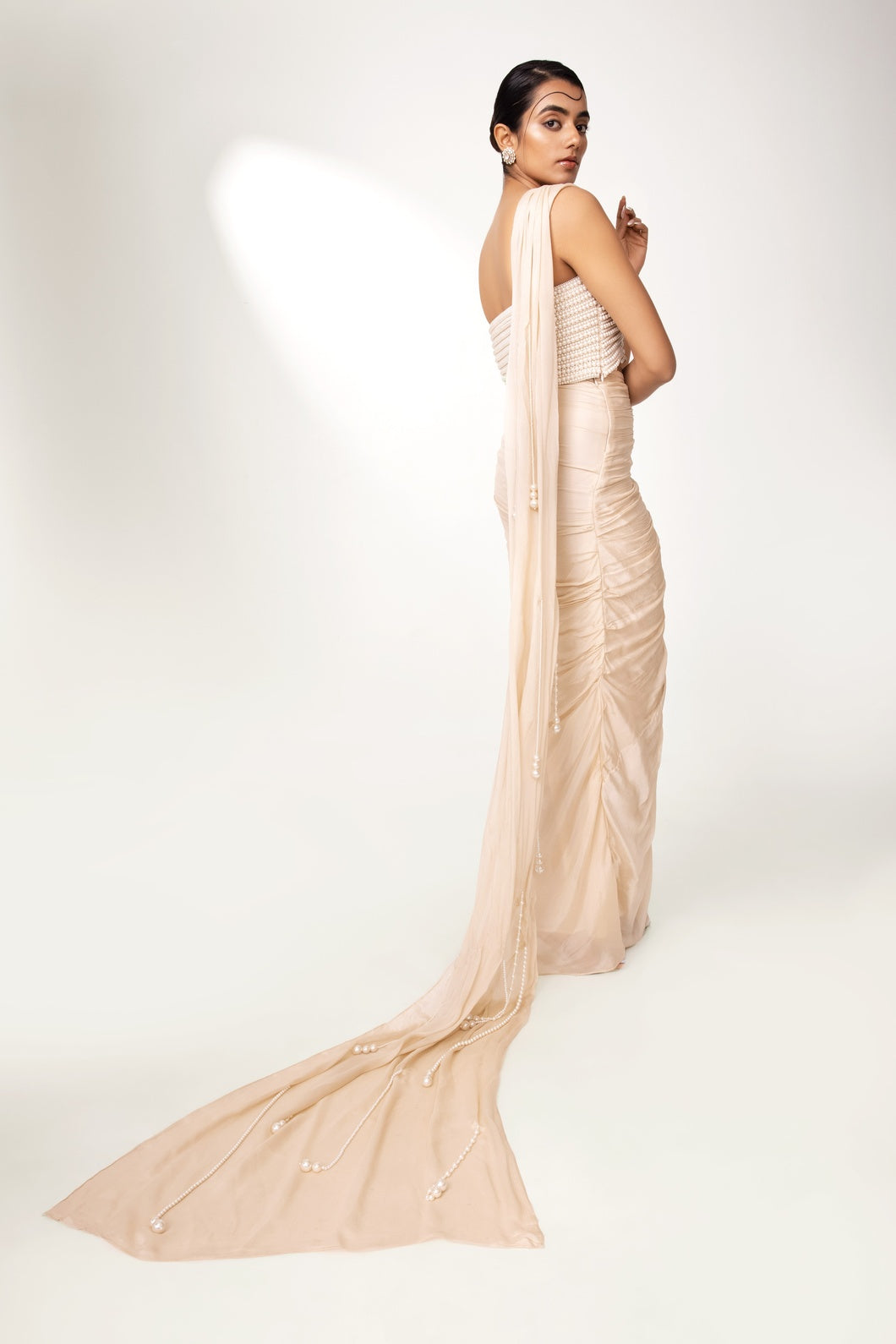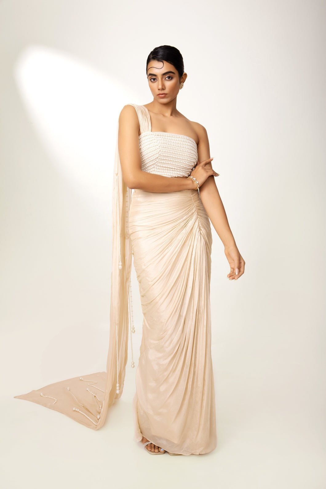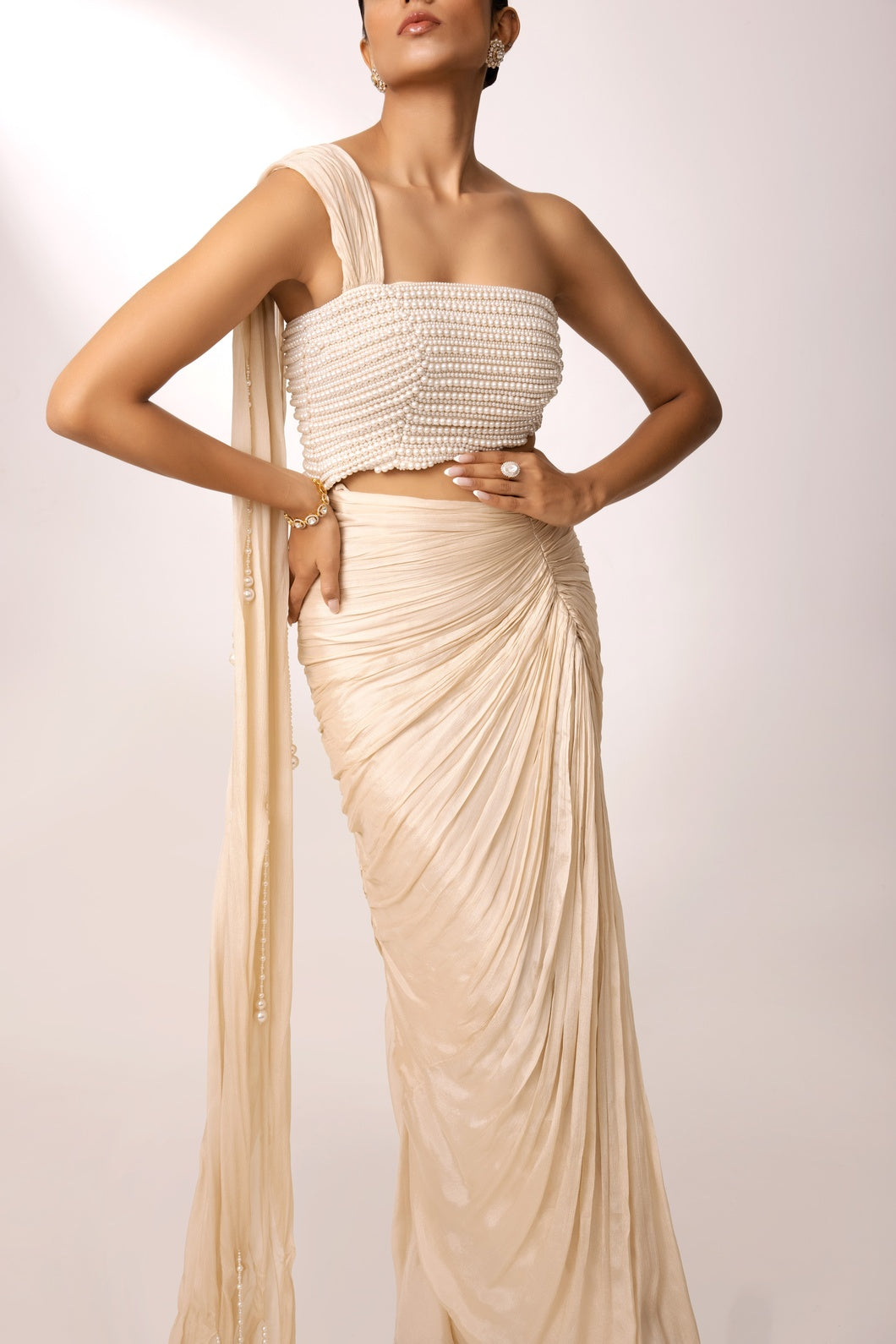 Our asymmetrical pearl-embellished blouse features intricate linear pearl work that created a sculpted, textural effect. Paired with one-shoulder style dupatta. The floor trailing dupatta has long scattered pearl tassels. Styled with a body sculpting skirt designed with an asymmetrical waistband and ruched draping.