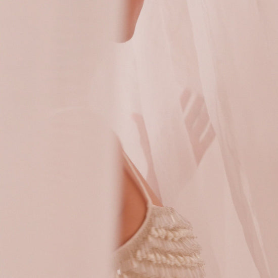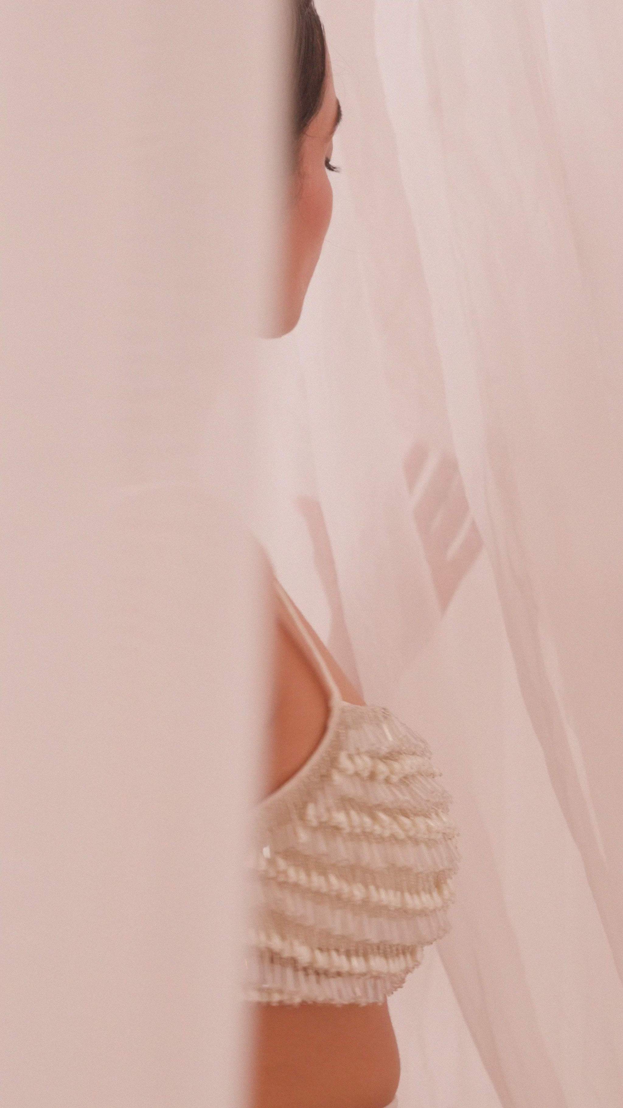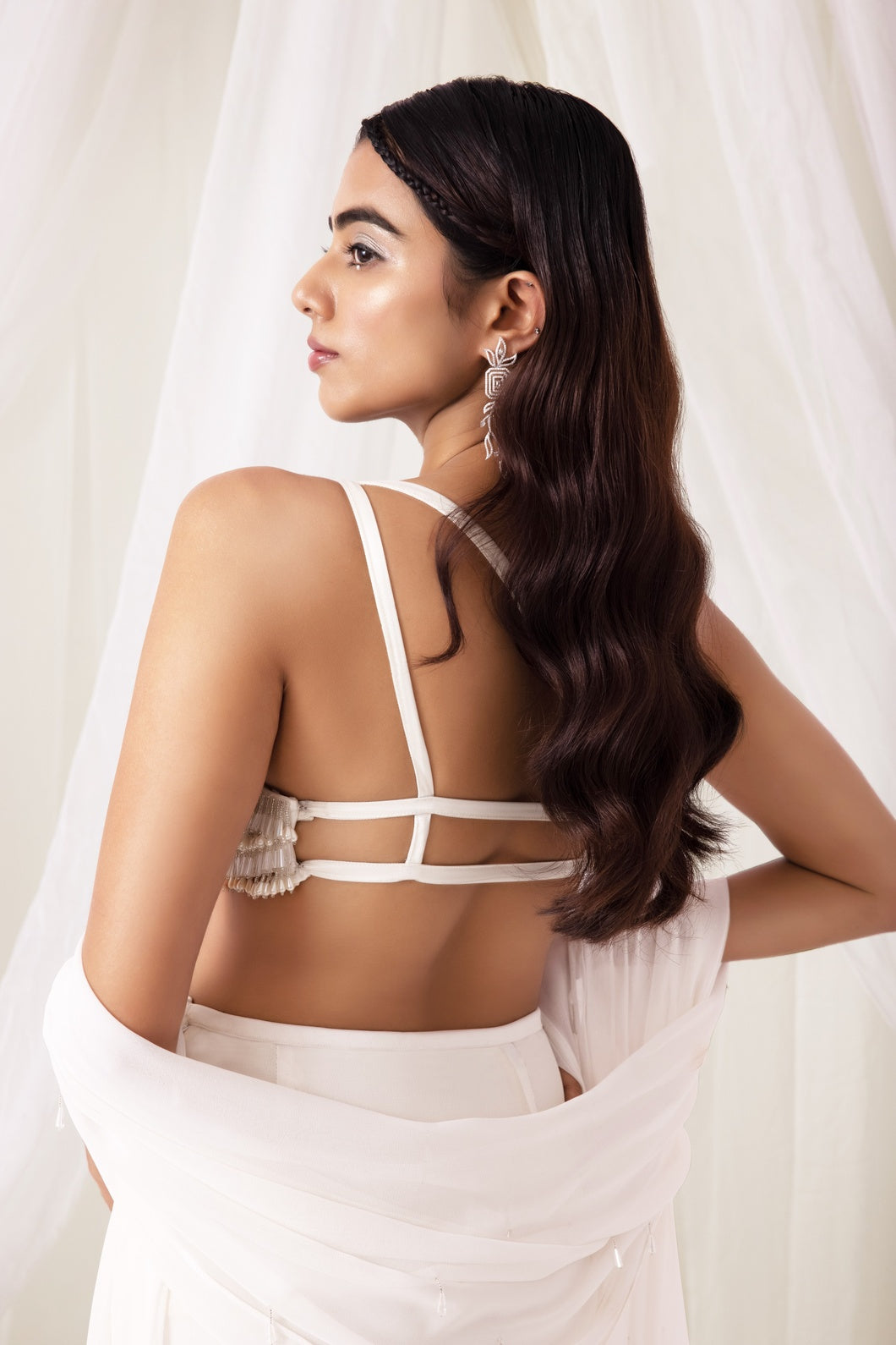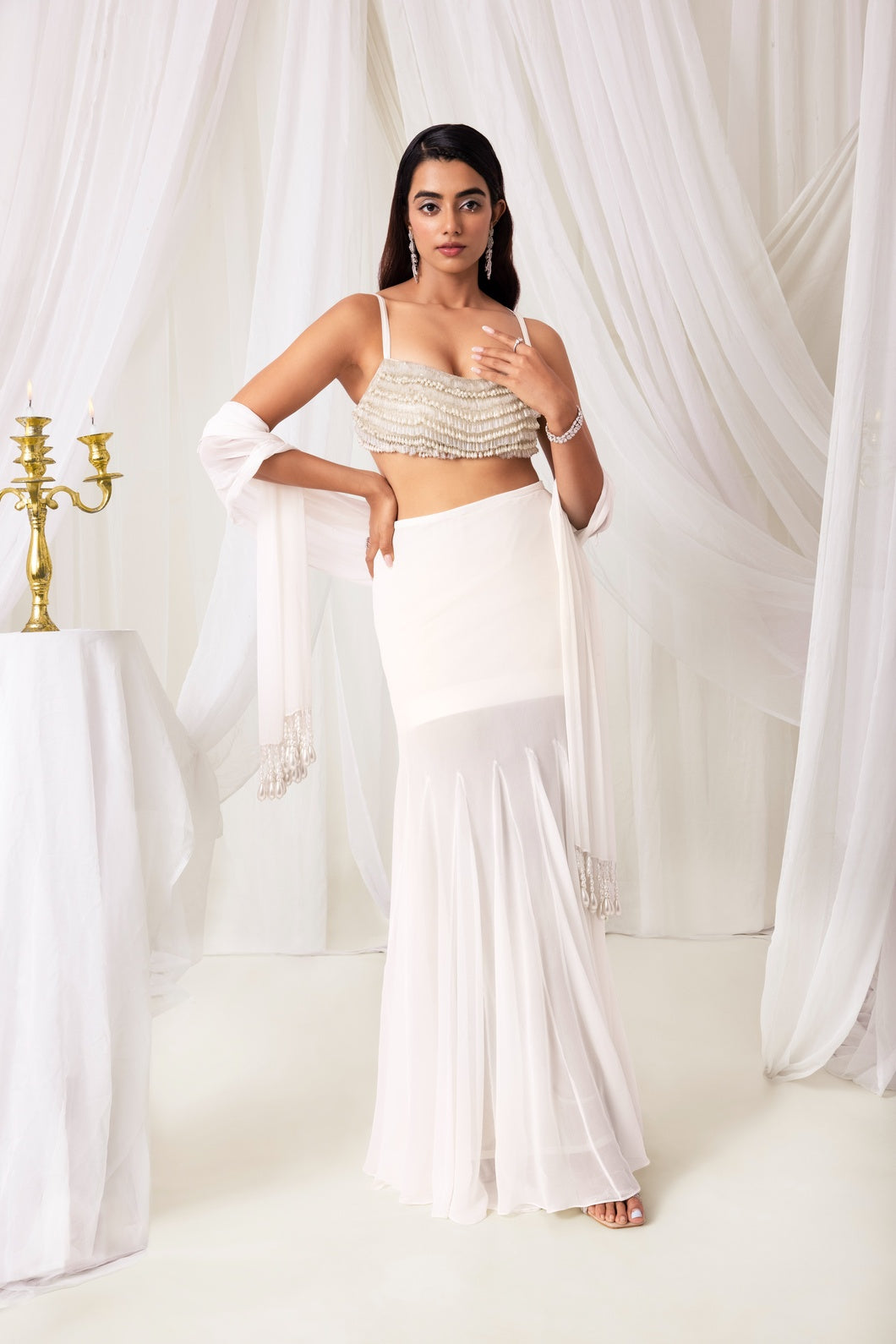 A pearl and crystal drop blouse with scalloped textures, and an open back, paired with sheer fish-cut skirt. Along with crystal-speckled dupatta, finished with cascading pearl tassel.