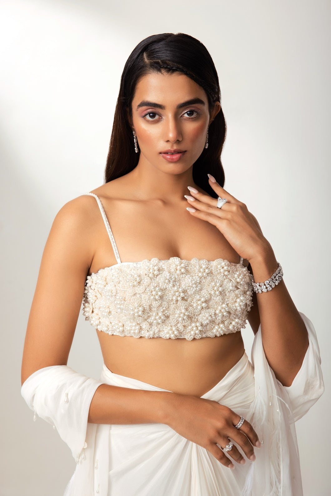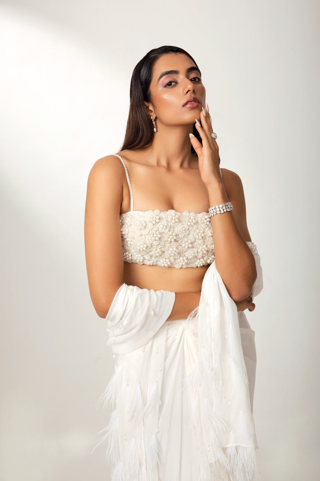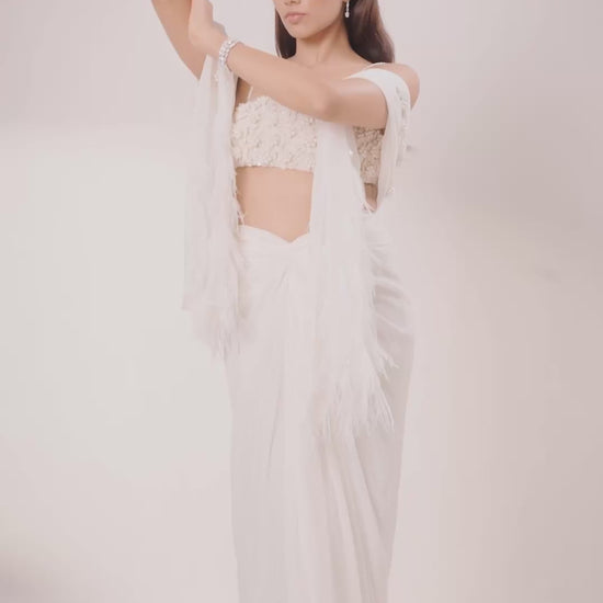 Hand-crafted 3D floral blouse, paired with a sculpted drape skirt and a sheer dupatta adorned with crystal tassels, delicate flowers, and feather detailing.