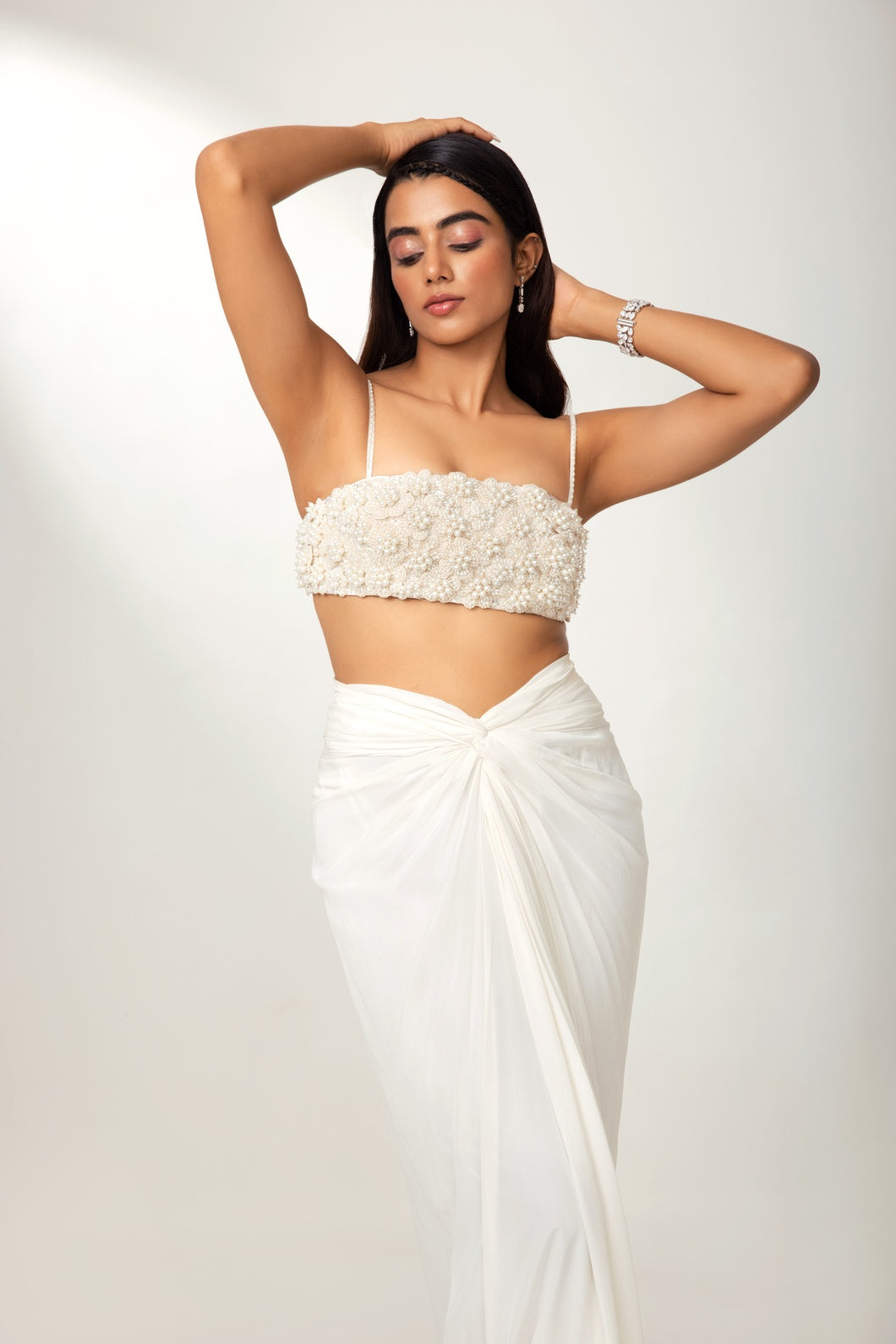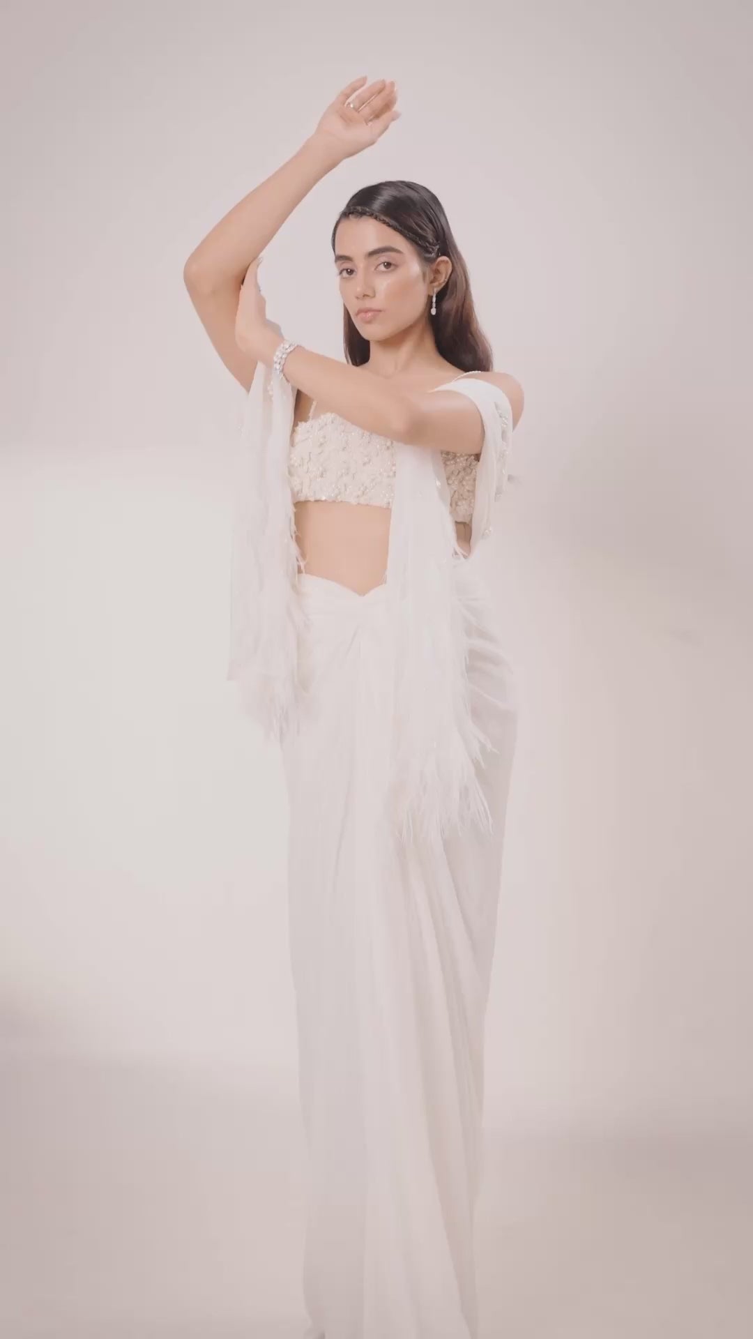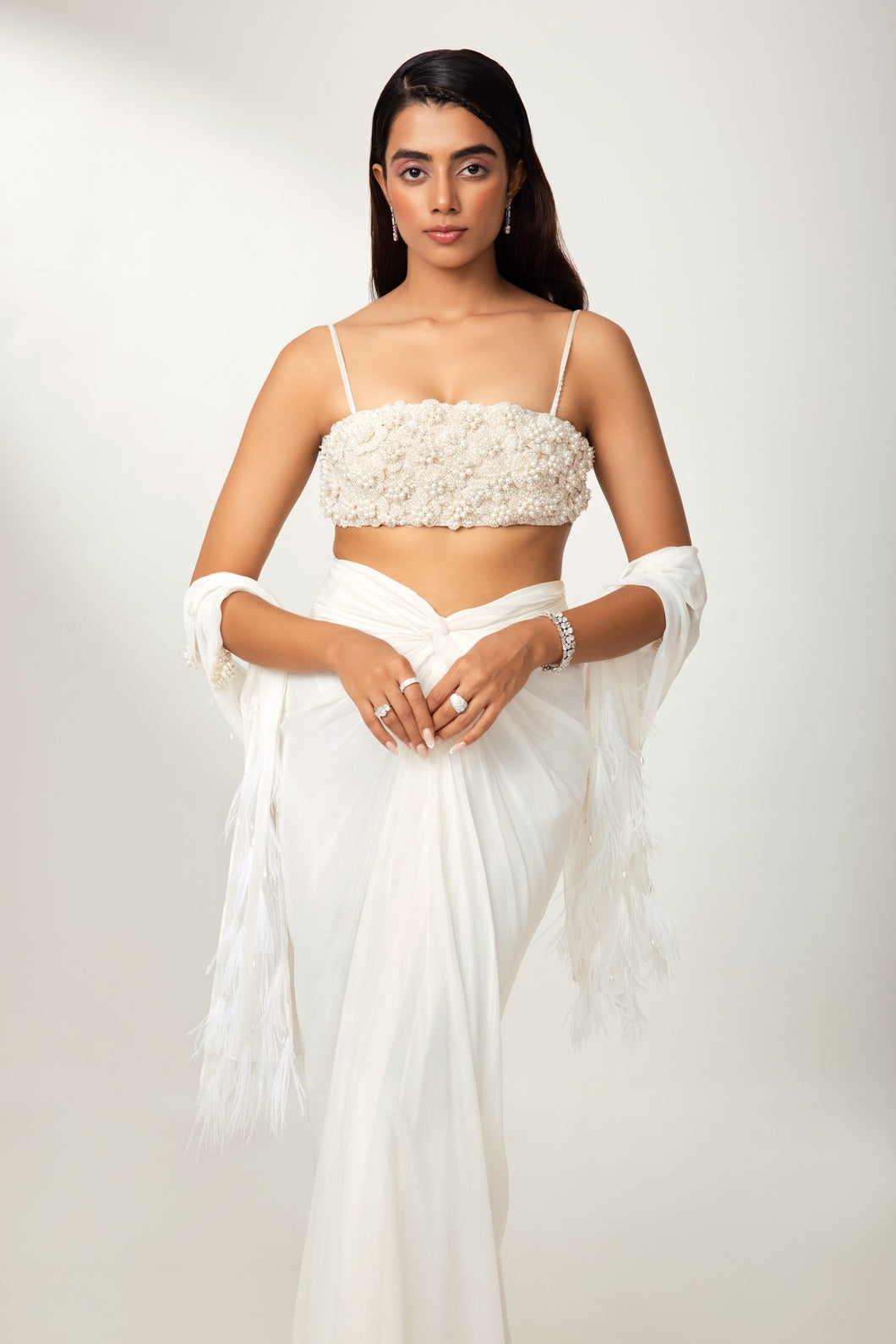 Hand-crafted 3D floral blouse, paired with a sculpted drape skirt and a sheer dupatta adorned with crystal tassels, delicate flowers, and feather detailing.
